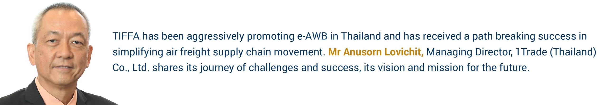 This has been a path-breaking journey for TIFFA achieving many milestones along the way. There has been a crucial increase in the number of customers handled on this platform. We are confident that this platform will further facilitate trade, in addition to Thailand’s National Single Window for electronic transactions, which is emerging as a critical requirement for global trade. During the economic crisis caused by the COVID-19 epidemic, TIFFA has been able to help the stakeholders to check the status of transmission 24 hours a day, simplifying the air freight supply chain.
